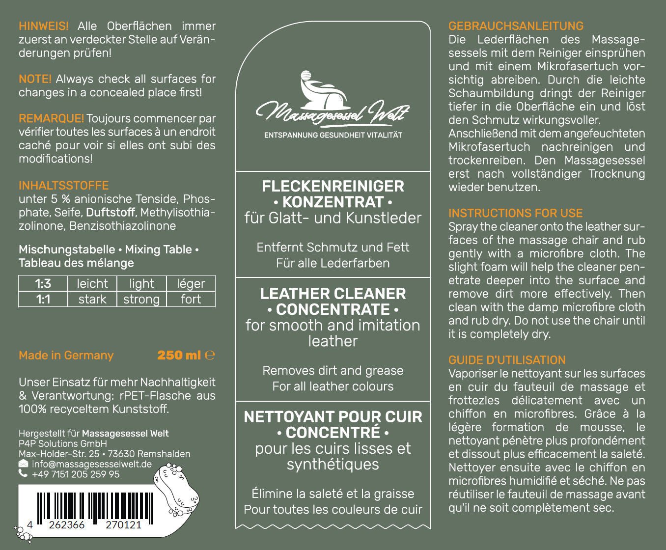 1 x 250ml Fleckenreiniger für Glatt-und Kunstleder - gebrauchsfertige Sprühflasche