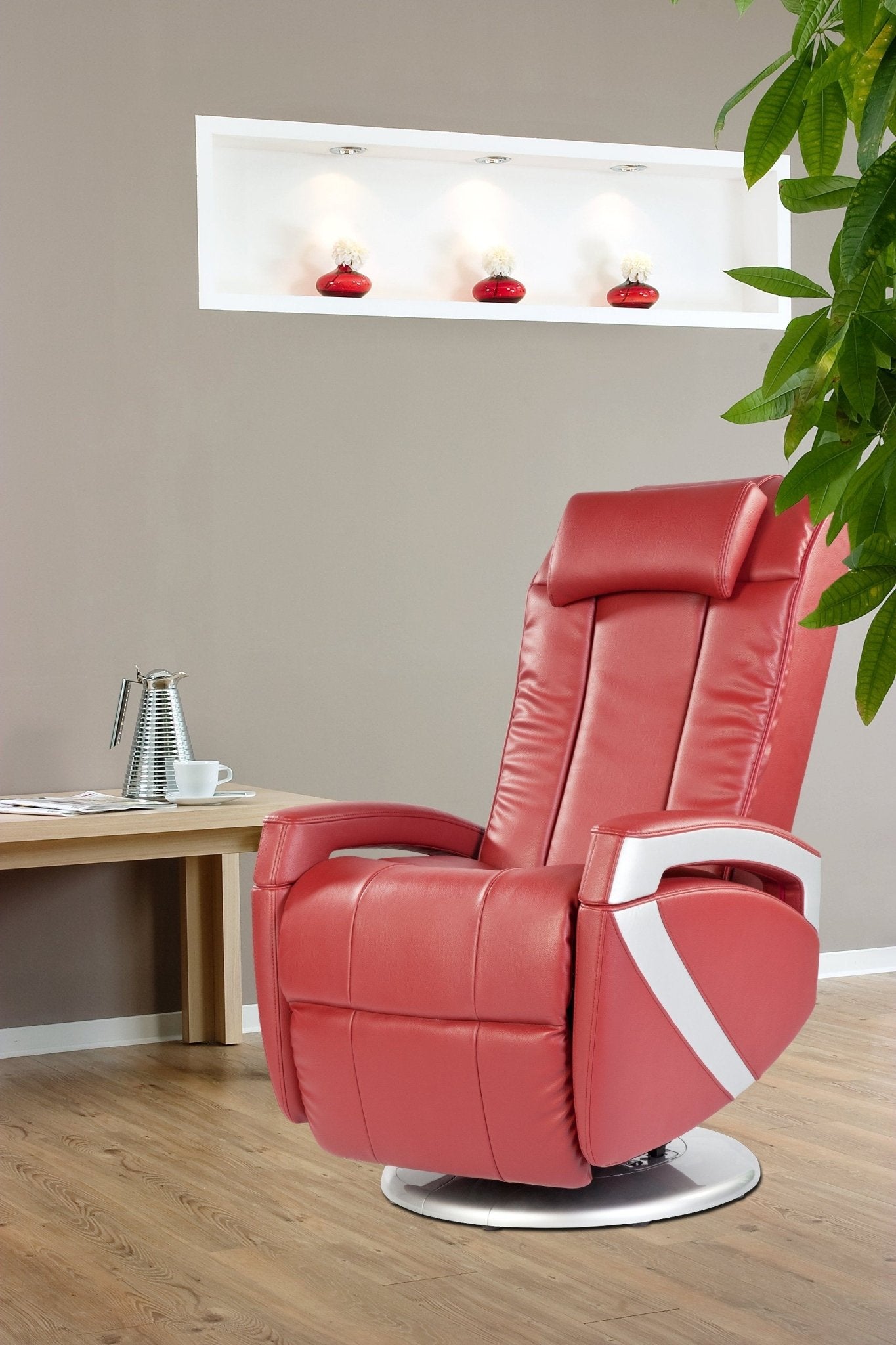 除了精选的技术和舒适的功能外,这款高品质的按摩椅还以其迷人的外观令人印象深刻。 Alpha Techno 的符合人体工程学形状的“优雅”AT 315 Wellfit 1A 为您提供高品质真皮套或易于护理的人造革之间的自由选择。有红色和黑色可供选择。由于其极其紧凑的尺寸,它给人留下了极其时尚的印象。由于座位区略微升高,即使对于身体残疾的用户来说,坐下和站起来也很容易。可爱的柔软靠背和足够长的脚踏板都可以相互独立地连续电动调节,引导您无缝地进入舒适的躺姿。其可移动底板允许“优雅”地旋转 180 度,非常适合晚上轻松看电视或舒适的午睡。